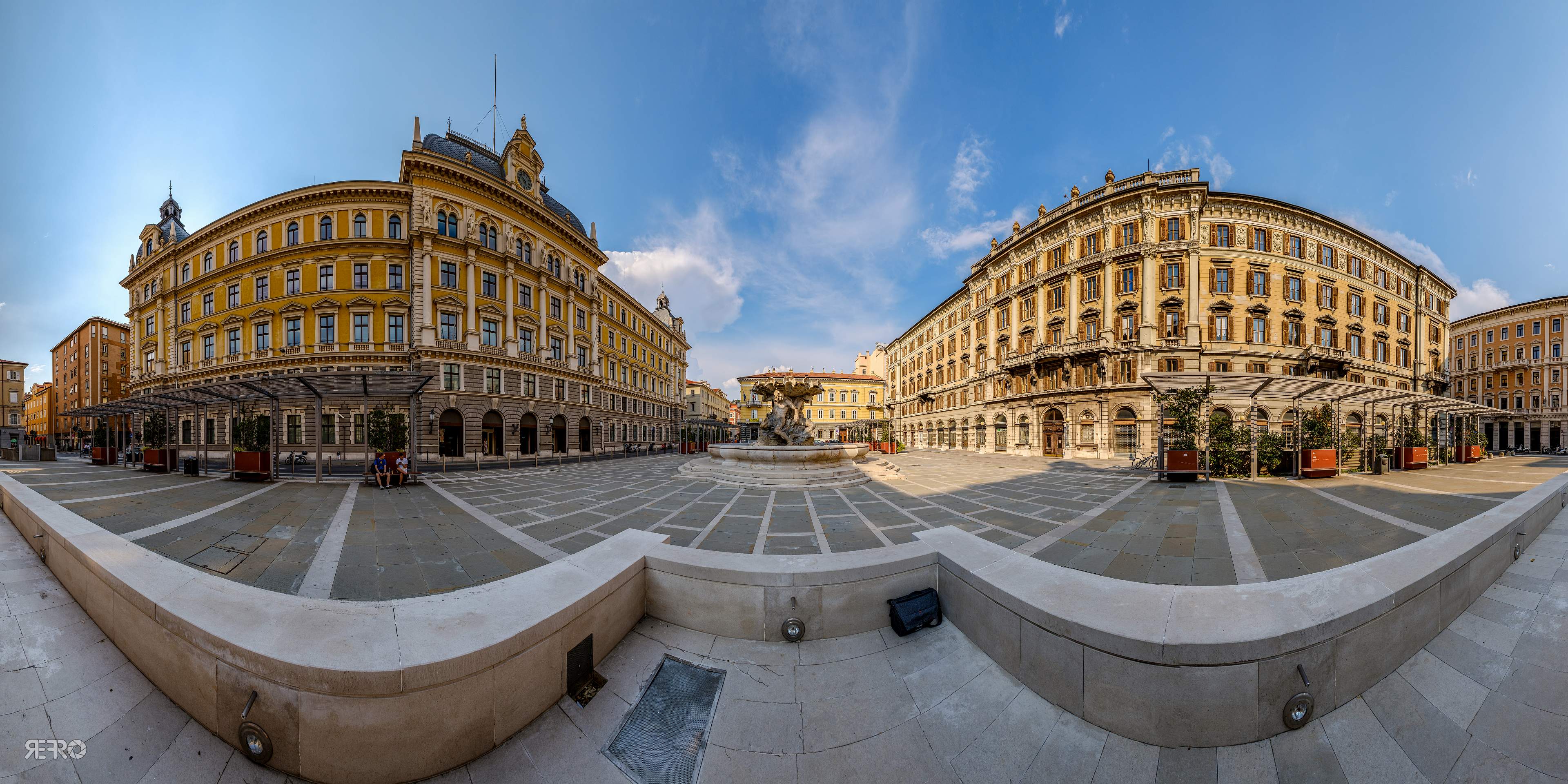 Ein Beispiel gefällig? Bitteschön: die Piazza Vittorio Venete mit dem Triton-Brunnen, der zum 50-jährigen Regierungsjubiläum des österreichischen Kaisers Franz Josef 1897 errichtet wurde, umsäumt von der regelmäßigen Fensterflut der alten Post- & Telegraphenverwaltung. Jedes Mal erneut ein Panorama wert!