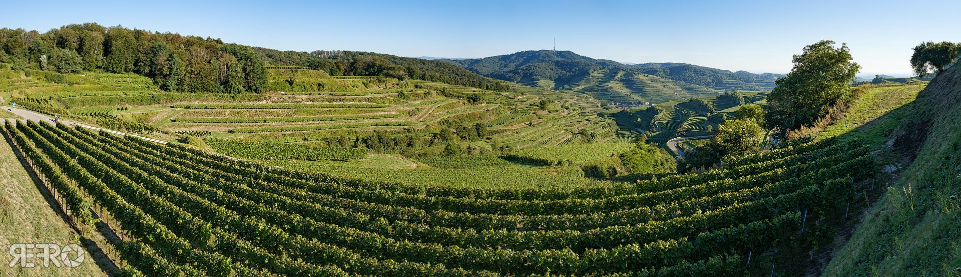 Wir kommen vom Norden über Kiechlingsbergen und nehmen die Oberbergener Straße, wo sich nach dem Wald rasch eine prachtvolle Aussicht vom „Auf dem Eck“ bietet. Der Aussichtspunkt Richtung der beiden Orte Oberbergen & Vogtsburg, sowie dem Kaiserstuhl selbst, wird wegen der vielen Serpentinen einer regionalen Radchallenge im Dreiländereck auch „Texaspass“ genannt. Tief eingeschnitten schlängeln sich durch die Reblandschaft die Kurven der Landstraße. Schönste Weinsicht Badens trägt stolz das Schild einer stilisierten Weinrebe auf dem nachfolgenden Parkplatz, der einen guten Blick auf die Terrassen der Weinlage Oberbergener Bassgeige ergibt und Dank der Dientreise kann ich auch noch meine zwei attraktiven Arbeitskollegen in die Szenerie mit integrieren. Fast schon kitschig schön 😉.