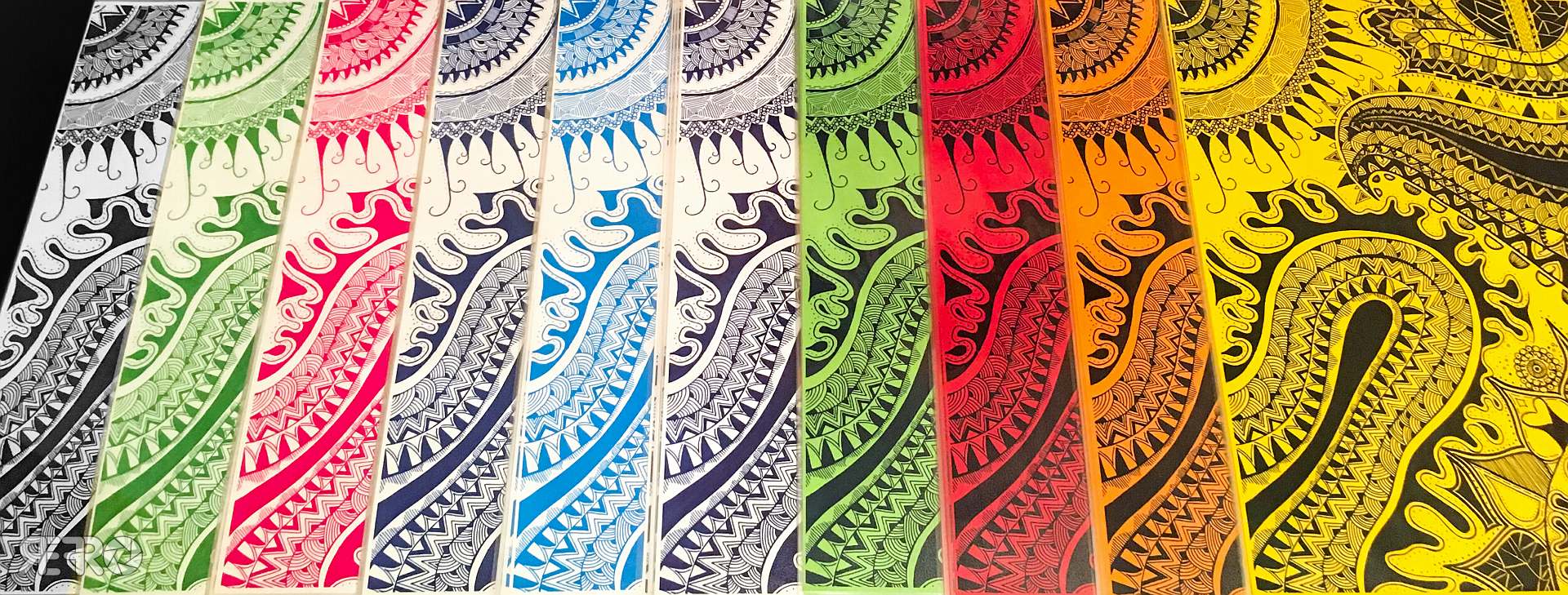 Diesmal hat Eva mit viel Muße und Zeit eine mE. wiederum sehr sehenswerte A3-Seite mit ihrem Muster gestaltet. Damit ihre Arbeit auch wirklich einer sinnvollen Verwendung zugeführt wird, haben wir uns diesmal einfärbige, laminierte Tischuntersetzer gestaltet. Die Farbpalette umfasst 10 Farbtöne – sechs Varianten mit farbigem Muster auf weißem Hintergrund, sowie vier Varianten mit schwarzem Muster auf färbigem Hintergrund: